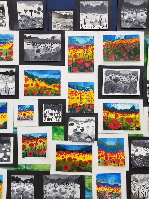 Our Art Room coordinator has continued her work with the students this term in drawing and painting. Students were introduced to acrylic paint and will be going back to charcoal drawing to reinforce the importance of practice with a familiar medium. She has also introduced printmaking to several classes, and worked with Ms. Harding's class to make prints for the Parent Council fundraiser. Eduarda has also started preparing with the teachers on the pinhole camera project. Below are a few examples of work that has been done: (kettle, is by Room 205 students, poppies are by Room 213 students, and the fish is by Room 209 students)